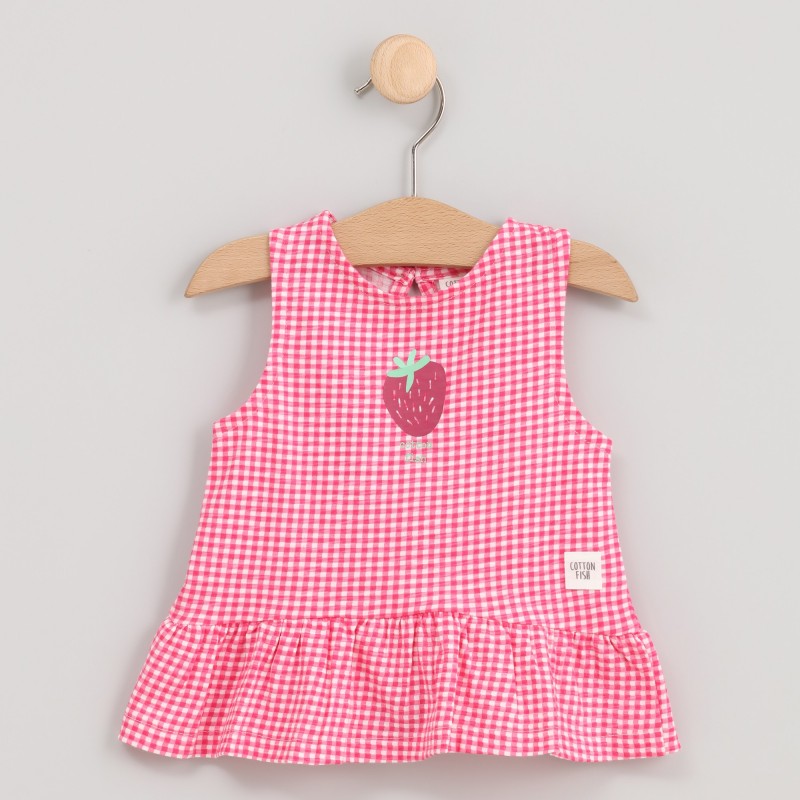 Top Pink Cream con estampado vichy y detalle de fresa, una prenda con un diseño dulce y actual que aporta un toque especial al look. Ligero y cómodo, es ideal para los días más cálidos, perfecto para combinar y acompañar cualquier plan con frescura y estilo.