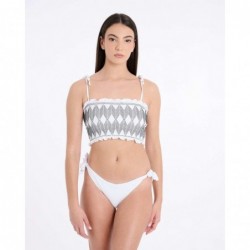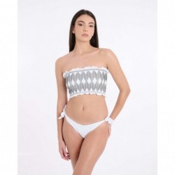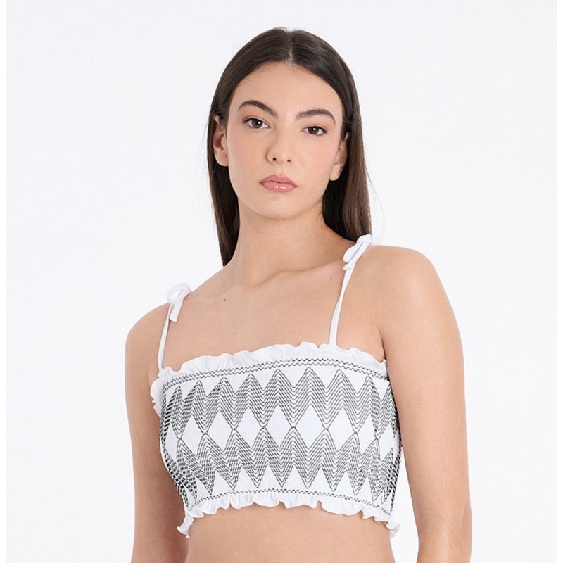 El top del modelo Delos se presenta en formato bandeau con tirantes y un diseño completo de tejido estructurado en motivo rombo. Su construcción tipo banda ofrece sujeción ligera y una estética geométrica muy actual. Una pieza que combina líneas limpias con textura para un resultado sofisticado y moderno.