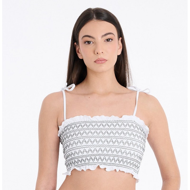 El top del modelo Delos se presenta en formato bandeau tipo banda, con una cenefa negra que recorre toda la superficie y aporta contraste y personalidad. Su diseño sin aros ofrece una sujeción cómoda y una silueta limpia, ideal para quienes buscan una pieza con carácter y líneas depuradas.