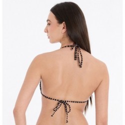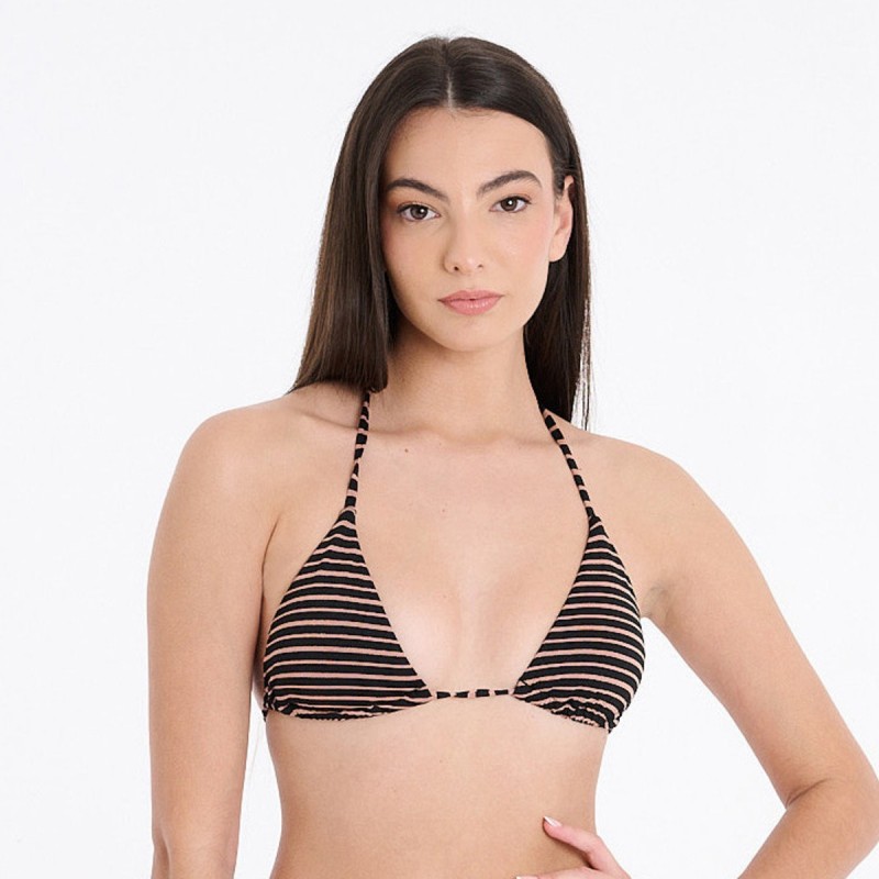 Este top de bikini tipo cortina está confeccionado en tejido con estampado de rayas, aportando un acabado gráfico y dinámico. Se ajusta mediante lazos al cuello y la espalda, lo que permite un fit adaptable y cómodo. Un diseño ligero y funcional con un toque visual marcado.