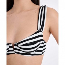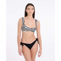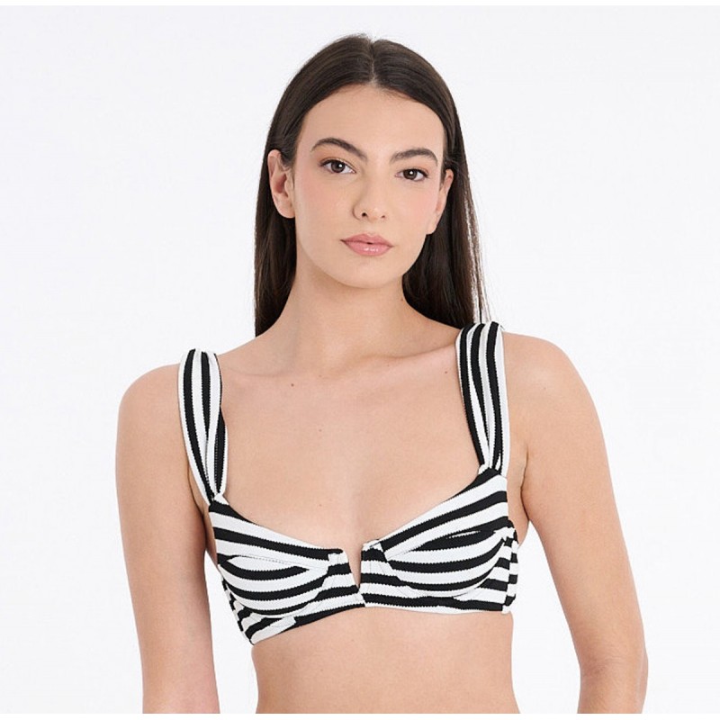 El top del modelo Santorini presenta un diseño balconette con tirantes anchos y estampado de rayitas, pensado para ofrecer mayor sujeción y un ajuste cómodo. Se cierra en la parte trasera con broche, garantizando firmeza y estructura. Una pieza con líneas limpias y un acabado gráfico sutil.