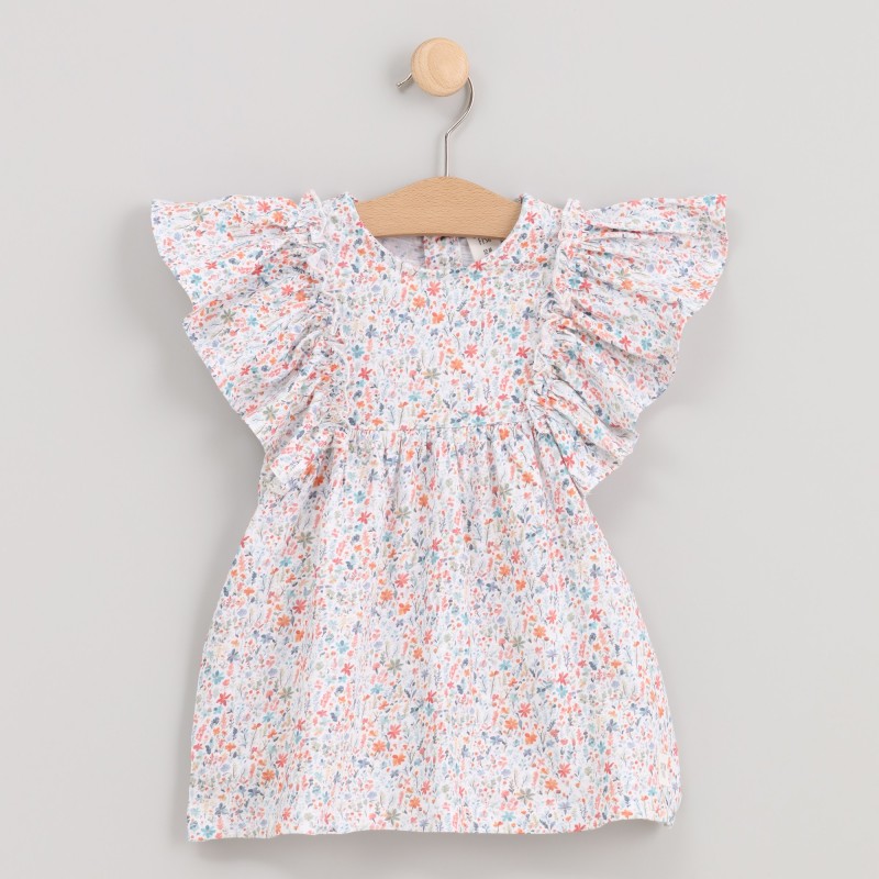 Vestido de manga corta Blooming con efecto mariposa en las mangas y estampado de pequeñas flores, una prenda que combina un diseño delicado con un aire fresco y actual. Ligero y cómodo, es ideal para los días más cálidos, aportando movimiento y un toque dulce al look infantil.