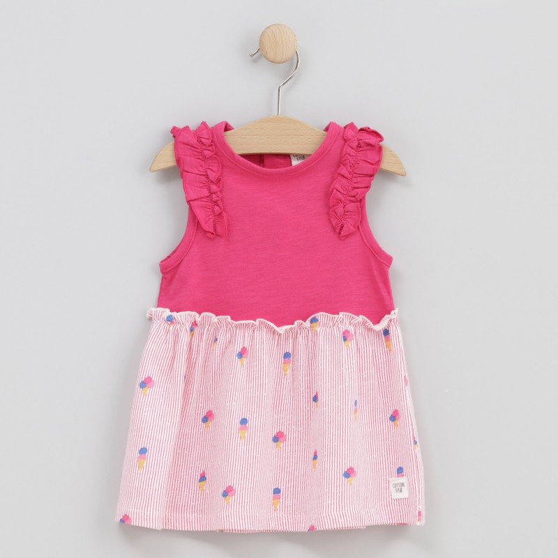 Vestido sin mangas Pink Cream con diseño combinado de rayas y motivos de helados, una prenda alegre y llena de encanto que aporta un toque dulce y original al look. Ligero y cómodo, es ideal para los días más cálidos, perfecto para acompañar cualquier plan con frescura y movimiento.