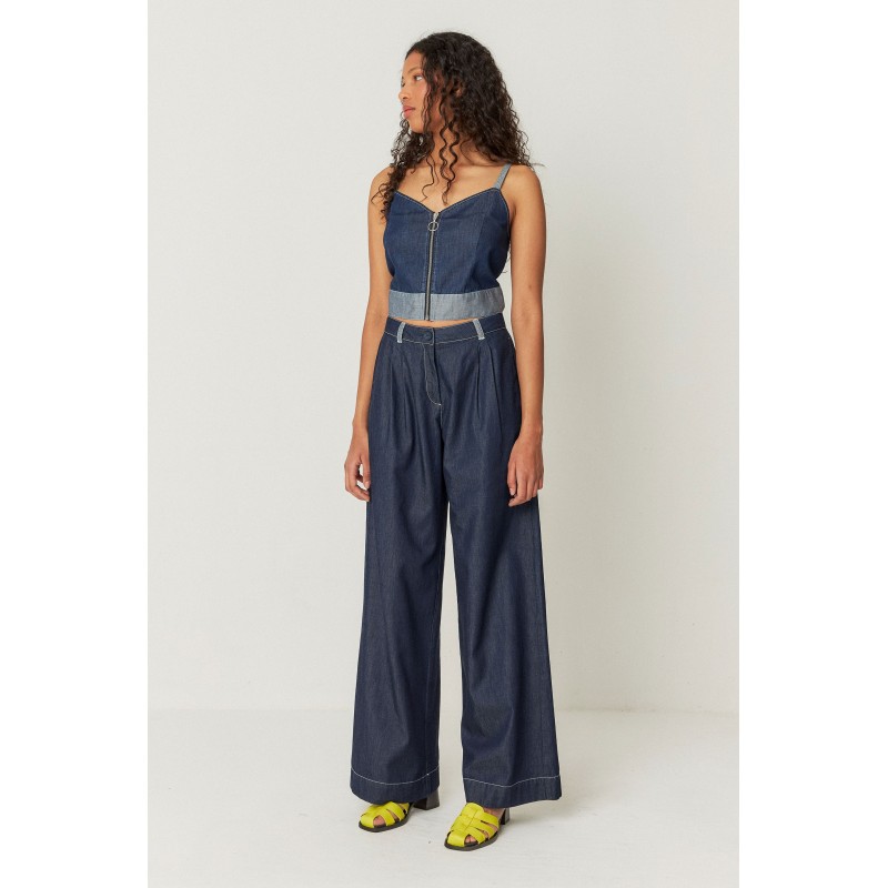 Pantalón recto de corte amplio con bolsillos a la altura de las costuras laterales y bragueta de cremallera y botón.