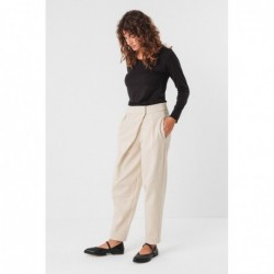 Pantalón de corte hasta el tobillo con un pliegue grande delante. Bragueta con cremallera y botón delante, bolsillos en las costuras laterales y falsos bolsillos traseros.