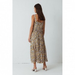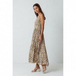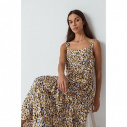 Vestido de tirantes acampanados de suave Lenzing Ecovero, con cuello cuadrado. Estampado multicolor sobre fondo amarillo.
