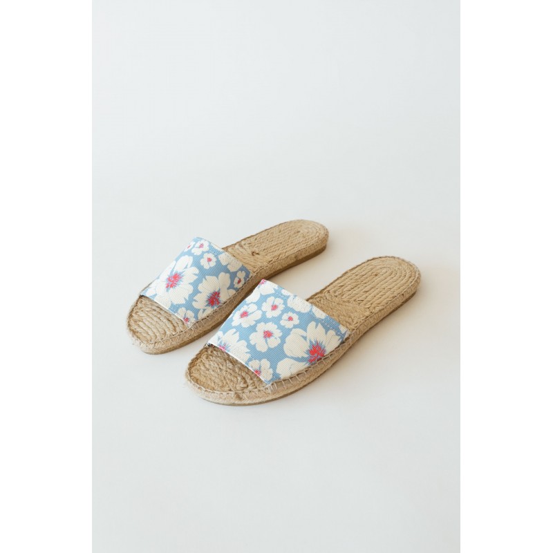 Sandalias fabricadas en Francia. Estampado floral sobre fondo azul claro.