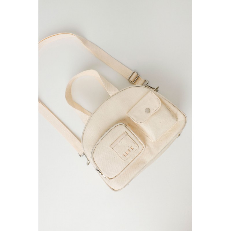 Bolso bowling de algodón reciclado con correa ajustable y bolsillos exteriores delanteros. Cierre de cremallera, forro estampado y bolsillo interior con cremallera.