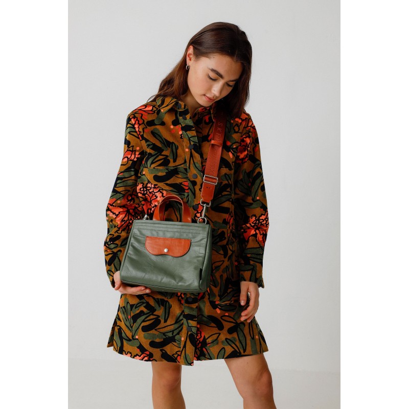 Bolso shopper de piel y algodón reciclado con bolsillos delanteros y traseros, correa ajustable y desmontable, cierre de cremallera y botones a presión para ajustar el tamaño. Con un bolsillo interior y forro estampado, mide 250 x 200 x 150 mm.