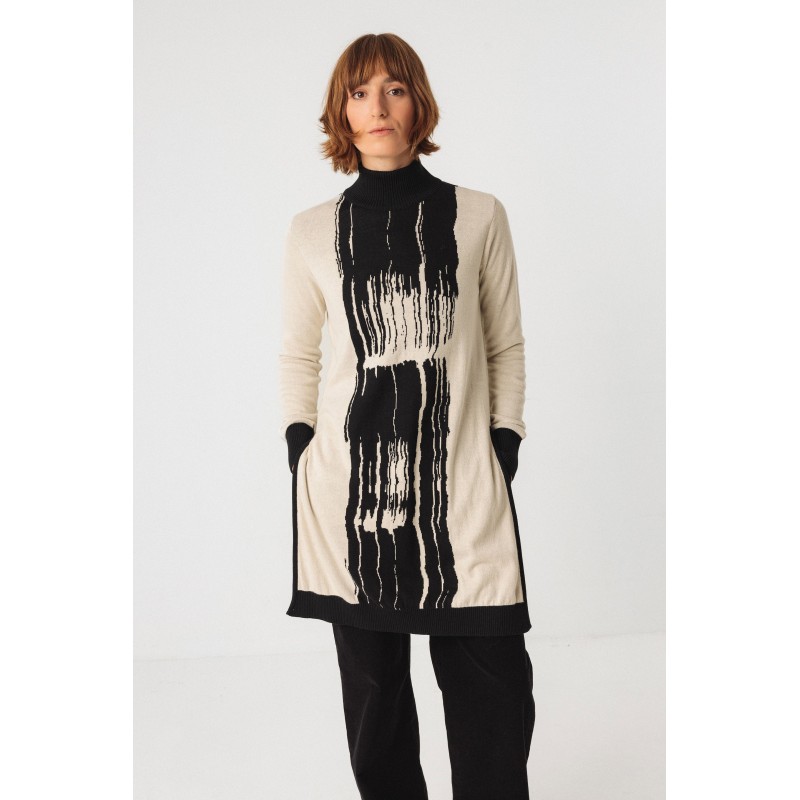Suéter largo de punto fino con un dibujo jacquard estructurado y cuello alto. Llega por encima de la rodilla y tiene unas aberturas largas en los laterales.