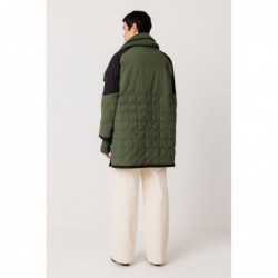 Abrigo corto tricolor con cuello chimenea de canalé y bolsillos delanteros grandes. Tiene el cierre de cremallera y botones a presión, además de otros botones a presión en los laterales. Colaboración con Martina Spetlova.