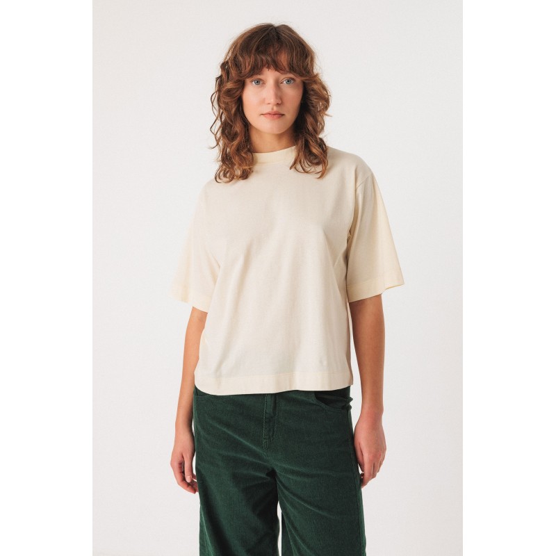 Camiseta holgada de manga corta y cuello alto hecha de algodón orgánico con certificado GOTS.