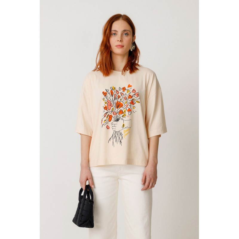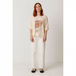 Camiseta de cuello redondo y manga corta con un estampado distintivo. Algodón orgánico con certificado GOTS.