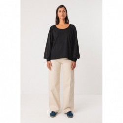 Camiseta holgada de cuello redondo y mangas murciélago. Detalles plisados en los puños y aberturas laterales.