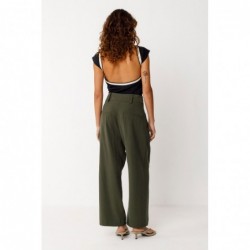 Pantalón de talle alto y pata ancha adornado con unos pliegues en la parte delantera. Lleva una bragueta de cremallera y bolsillos en los laterales. Largo total en una talla 38: 95 cm.