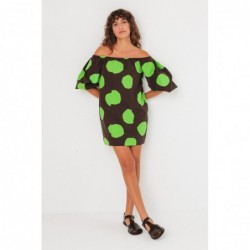 Minivestido de cuello barco elástico y mangas 3/4 abullonadas. Fácil de poner.