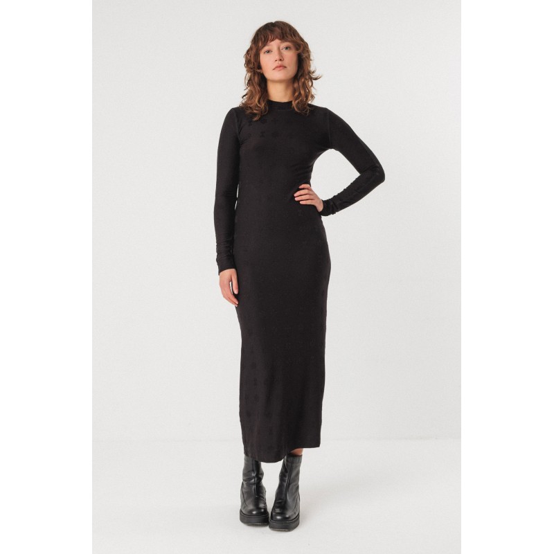 Vestido largo ceñido de tejido stretch. Llega hasta el tobillo, es de manga larga, tiene el cuello alto y lleva unos pespuntes de adorno. Fácil de poner.