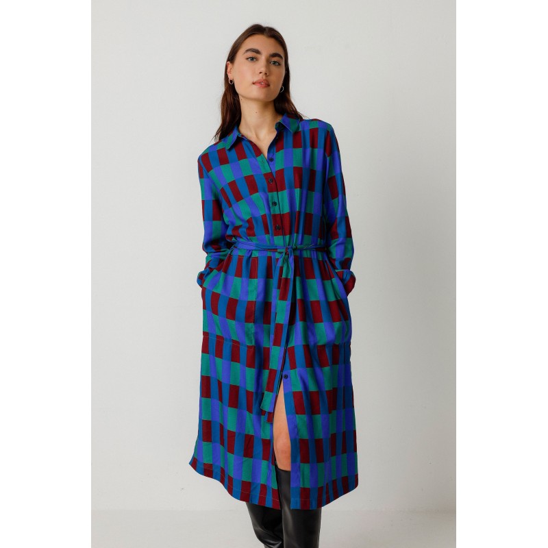 Vestido camisero largo de forma normal, cuello camisero, manga larga, bolsillos delanteros, cierre delantero abotonado y cinturón desmontable. Estampado geométrico multicolor.
