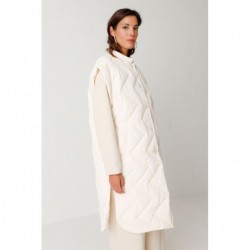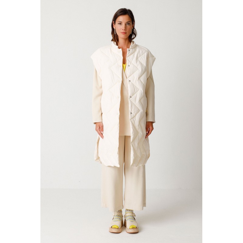 Chaqueta larga acolchada sin mangas hecha con nailon reciclado y relleno reciclado Dupont Ecodown. Pespuntes en contraste.