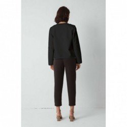 Chaqueta corta de manga larga con cierre delantero abotonado, cuello redondo y bolsillos de parche.