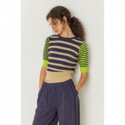 Pull col rond avec manches 3/4 et bordure en tricot côtelé au niveau du cou, de la taille et des poignets.
