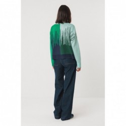 Pull court en maille jacquard semi-épaisse. Il présente des manches longues, une encolure ronde et des bords-côtes à l'encolure, à la taille et aux poignets.