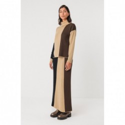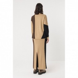 Pull en maille semi-épaisse avec une coupe asymétrique, un col montant et des détails de couleurs contrastées.