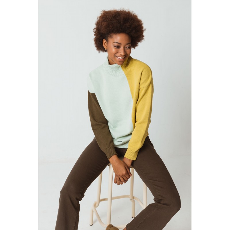 Pull en maille de coton biologique certifié GOTS et Fairtrade®, avec un col roulé côtelé double épaisseur et un design bicolore agrémenté d'une fente à l'ourlet. Vert céladon. L'obtention de la certification est une grande satisfaction. La certification Fairtrade® nous permet de garantir une rémunération équitable à nos producteurs de coton biologique et de soutenir le développement de projets communautaires. GOTS est la certification de référence pour la production de textiles en fibres biologiques.