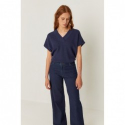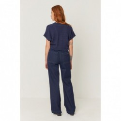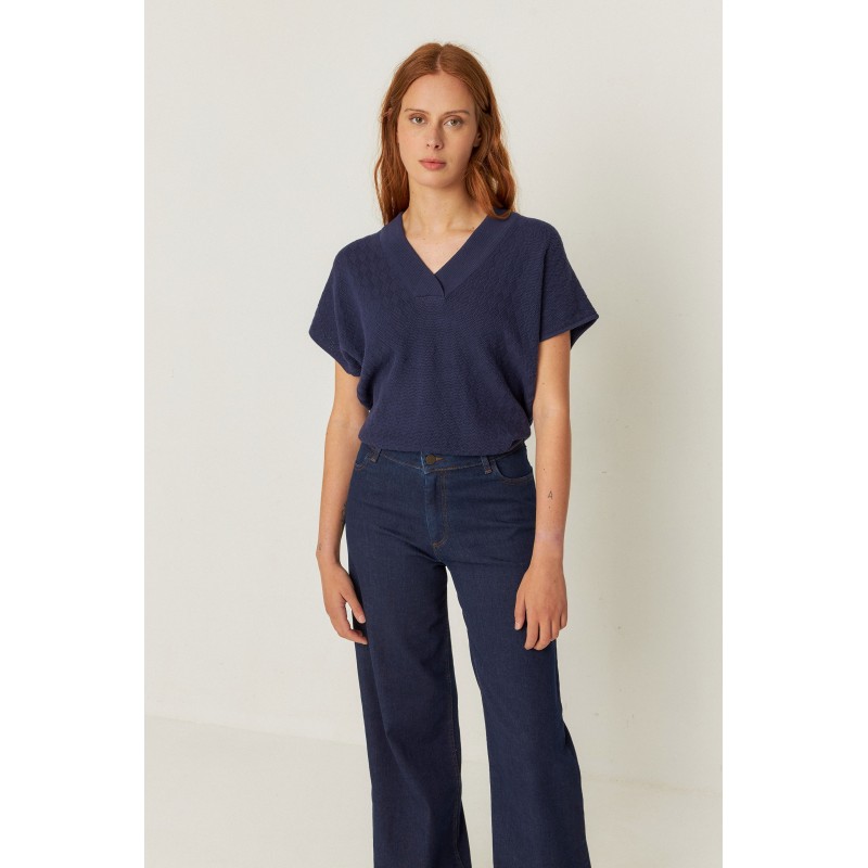 T-shirt à manches courtes et col V en jersey de coton biologique. Bords côtelés au col et à la taille.