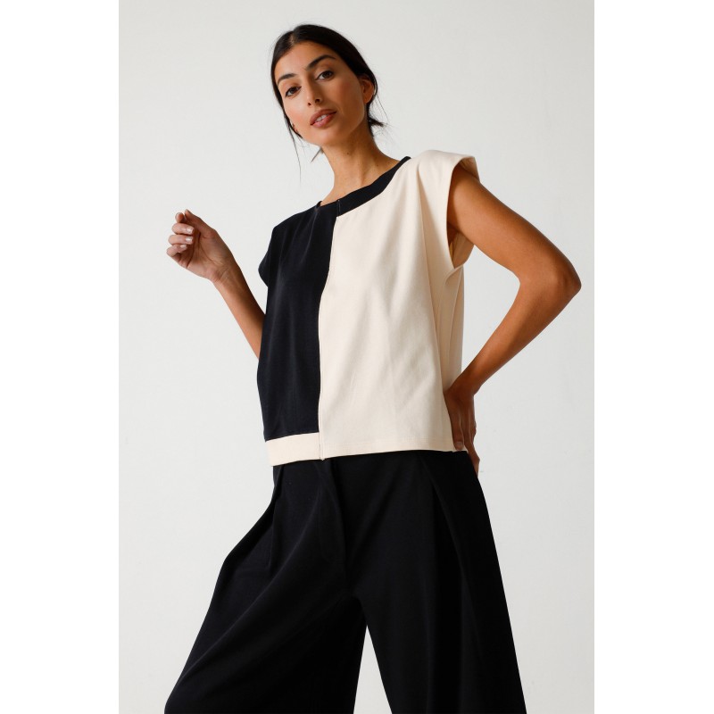 T-shirt à manches courtes et col rond, avec détails en maille côtelée au niveau du col et des côtés.