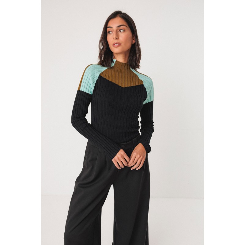 T-shirt à manches longues en maille côtelée fine avec col montant et patchs de couleurs contrastées.