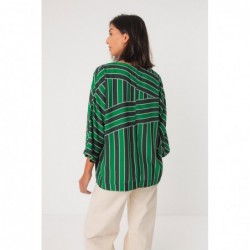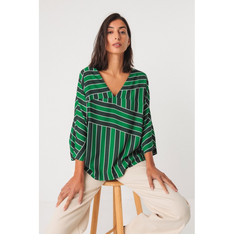 Chemise coupe droite avec col en V et manches 3/4. Les rayures varient selon la coupe du tissu, rendant chaque modèle unique.
