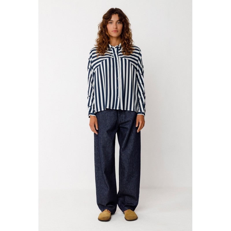 Chemise à manches longues avec un col classique, une fermeture boutonnée sur le devant et un ourlet arrondi plus long à l'arrière. Les boutons sur toute la longueur de la manche peuvent être ouverts pour dévoiler le bras.