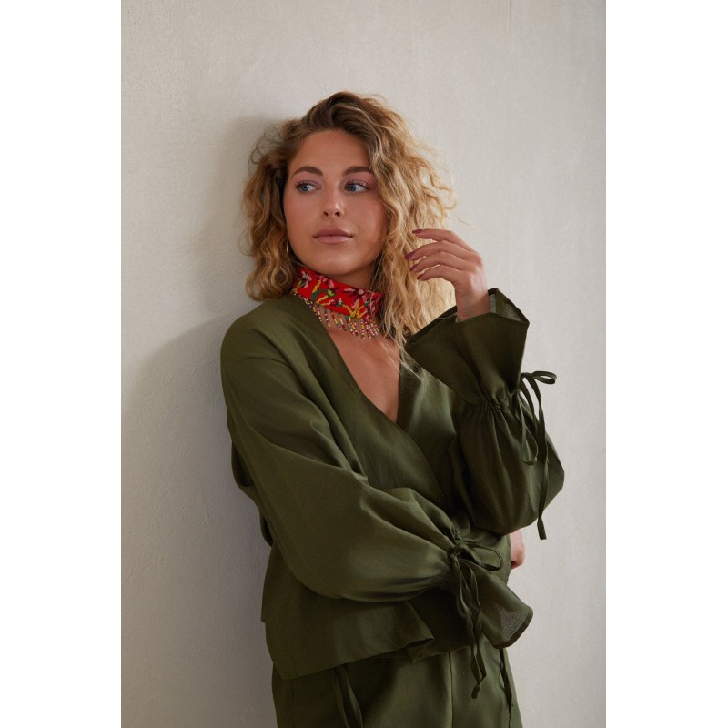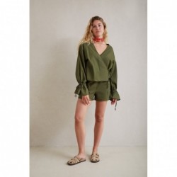 Chemisier en lin. Décolleté en V, manches longues amples, poignets ajustés et lien à nouer. Fermeture cache-cœur. Ce chemisier en lin allie fraîcheur et élégance. Il présente un décolleté en V, des manches longues amples et un lien à nouer. Choisissez votre taille habituelle. Le mannequin mesure 1,72 m et porte une taille S. Vous pouvez l'associer au short en lin Calma.