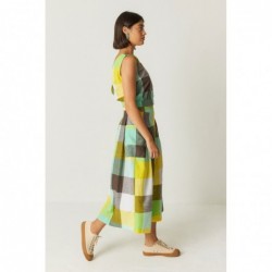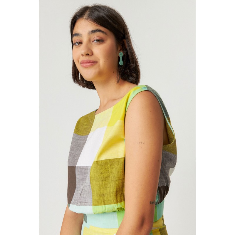 Chemise courte sans manches à col bateau. Coupe ajustée et dos boutonné. Imprimé à carreaux.