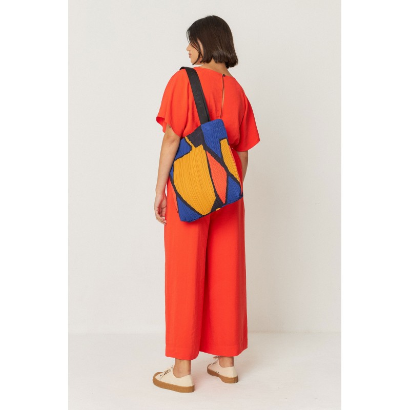Sac cabas en tissu plissé imprimé avec deux anses. Entièrement doublé et doté d'une fermeture à pression. Dimensions : 30 x 40 cm.