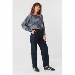 Jean large longueur cheville avec braguette zippée sur le devant et poches latérales.