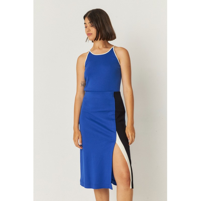 Jupe évasée sous le genou avec taille élastique et fente sur le devant.