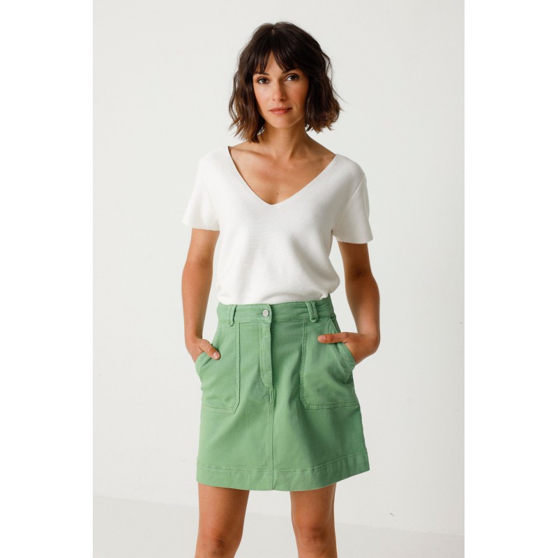 Fabriquée en Espagne. Jupe courte droite en coton biologique avec poches avant, fermeture éclair sur le devant et passants de ceinture.