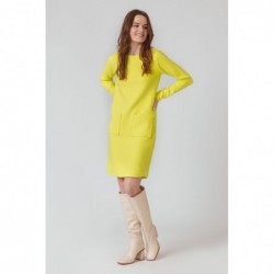 Cette robe droite en coton extensible présente une longueur au-dessus du genou, un col rond, des manches longues et deux poches plaquées sur le devant. Elle est de couleur vert clair.