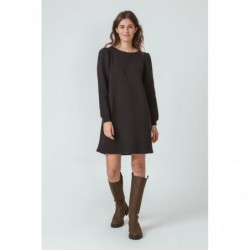 Robe trapèze, longueur au-dessus du genou, en coton biologique texturé. Col rond et manches longues. Couleur lilas. Le coton biologique est cultivé selon des méthodes et des matériaux à faible impact environnemental. Cela signifie qu'aucun engrais ni pesticide toxique n'est utilisé et que la fertilité des sols est préservée. Le mannequin porte une taille 38 et mesure 1,73 m.