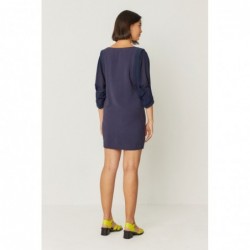 Robe droite à enfiler, au-dessus du genou. Col rond et manches courtes chauve-souris.