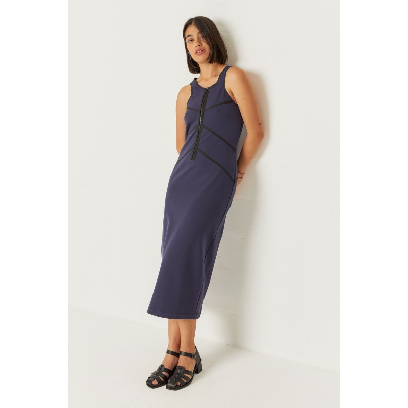 Robe sans manches à la silhouette longue et ajustée. Dotée d'une encolure ronde et d'une fermeture zippée sur le devant, elle est ornée de surpiqûres contrastées au niveau des fentes.