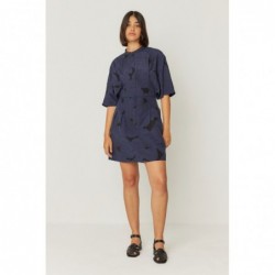 Robe courte en jacquard avec taille marquée, col mao et manches courtes évasées. Elle est dotée de poches pour les mains et d'une fermeture zippée sur le devant.