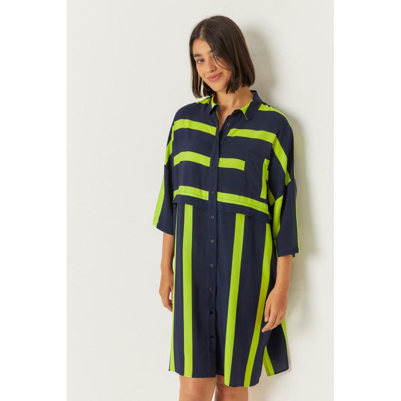 Robe ample avec une coupe au-dessus du genou. Manches 3/4 et fermeture boutonnée sur le devant.