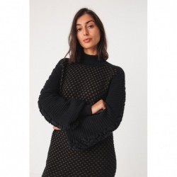 Robe bicolore en maille semi-épaisse à effet texturé. Coupe droite au-dessus du genou, encolure haute côtelée et manches longues bouffantes côtelées.