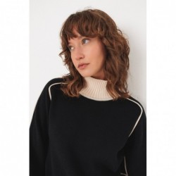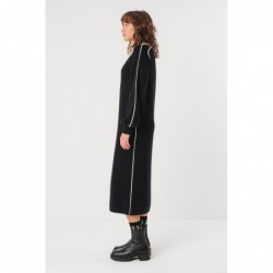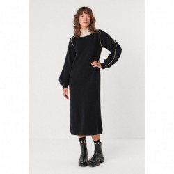 Robe mi-longue en maille de coton biologique semi-épaisse. Elle est ornée de surpiqûres contrastantes, assorties au col roulé côtelé. Sa coupe droite est dotée de manches bouffantes.