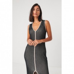 Robe mi-longue en maille côtelée semi-épaisse bicolore. Sans manches et décolleté en V profond.