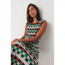 Robe sans manches en maille semi-épaisse multicolore. Elle descend jusqu'à la cheville, possède un col rond et un motif à carreaux.
