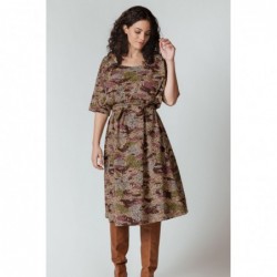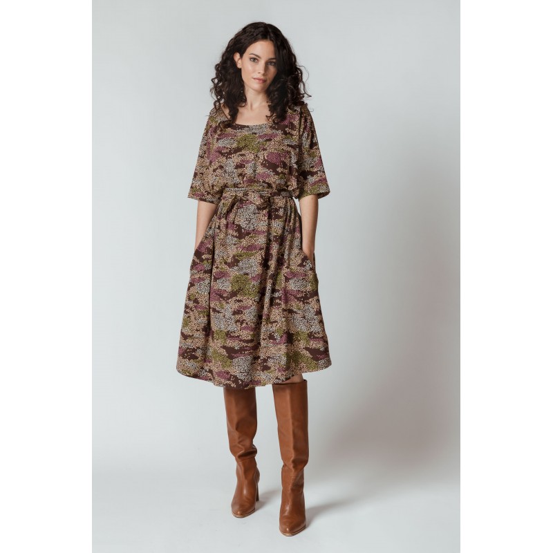 Cette robe midi confortable, confectionnée en coton stretch, bénéficie d'une conception zéro déchet qui minimise les chutes de tissu. Ajustable grâce à une ceinture, elle est ornée d'un imprimé camouflage.